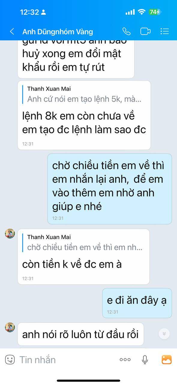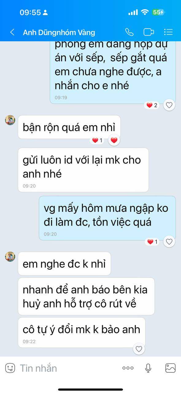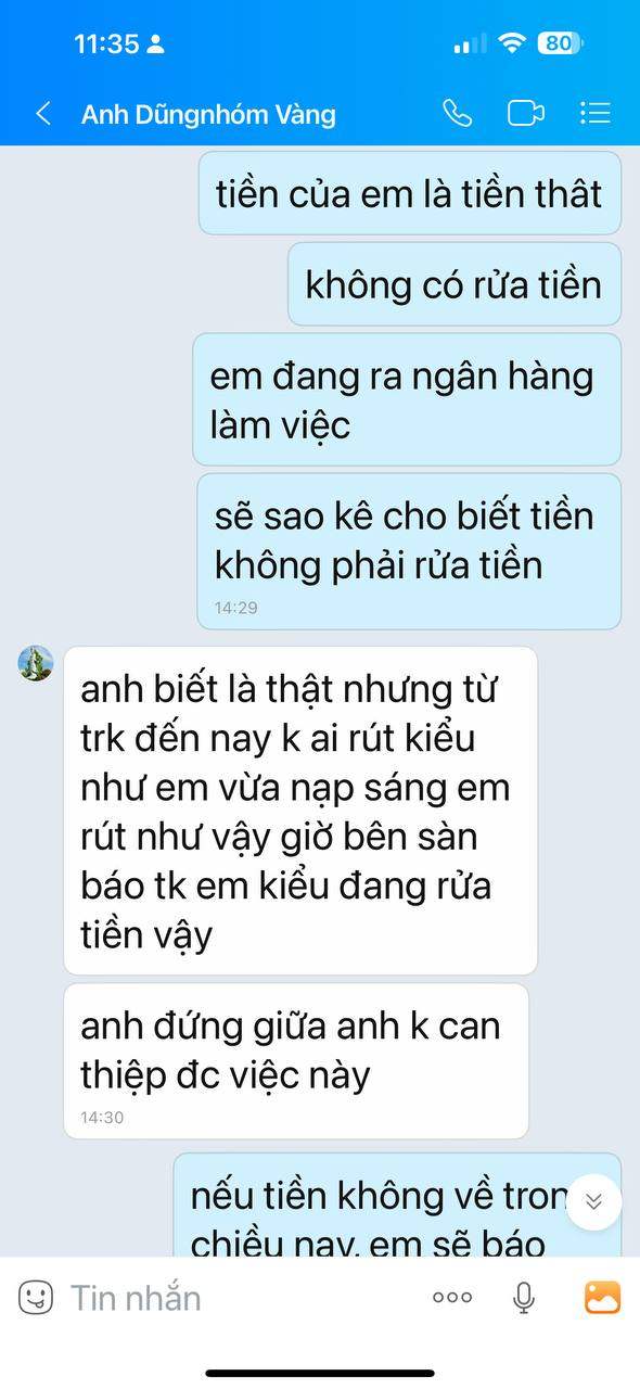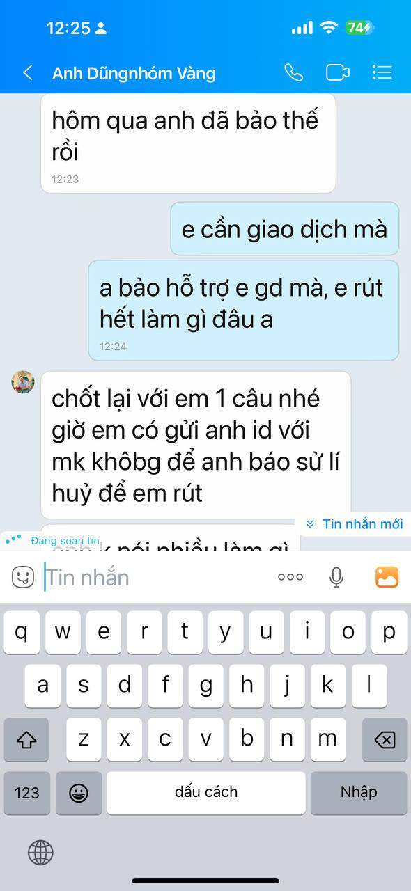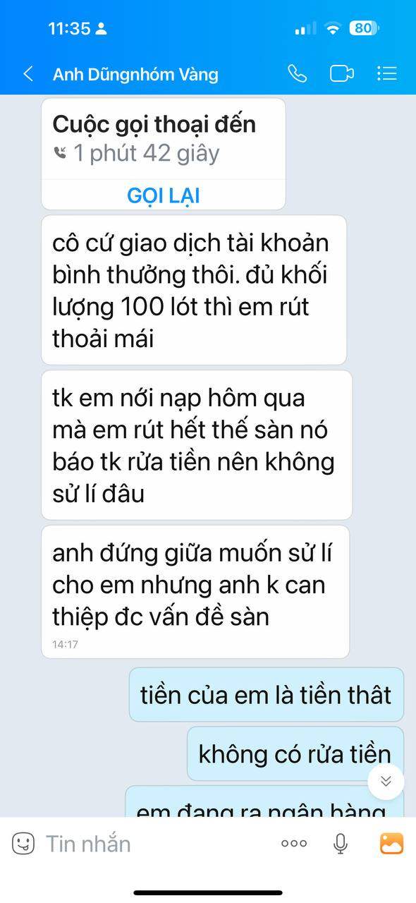 Lúc nó hướng dẫn mình mở tk giao dịch xong nó bảo mình cung cấp id và mk sàn gửi trong mail để nó hướng dẫn mình quản lý tk, mình đã cung cấp cho nó. Sáng hôm sau mình thấy nó tự vào lệnh mình thấy âm mình cắt xong mình đổi mk ko cho nó giao dịch nữa. Mình làm lệnh rút tiền nó đòi id và mạt khẩu giao dịch vàng thì nó mới báo sàn duyệt lệnh rút cho. Nhưng mình ko cho nó lại nữa. Nó cứ gây khó dễ và nhất định ko hỗ trợ rút tiền và còn bảo là sàn ko cho rút vì nạp vào rút ra ngay là rửa tiền. Nhung thật ra mình thấy ko an toàn là mình rút. nhưng nay 2 ngày rồi nó vẫn treo tiền của mình chưa chuyển về.
