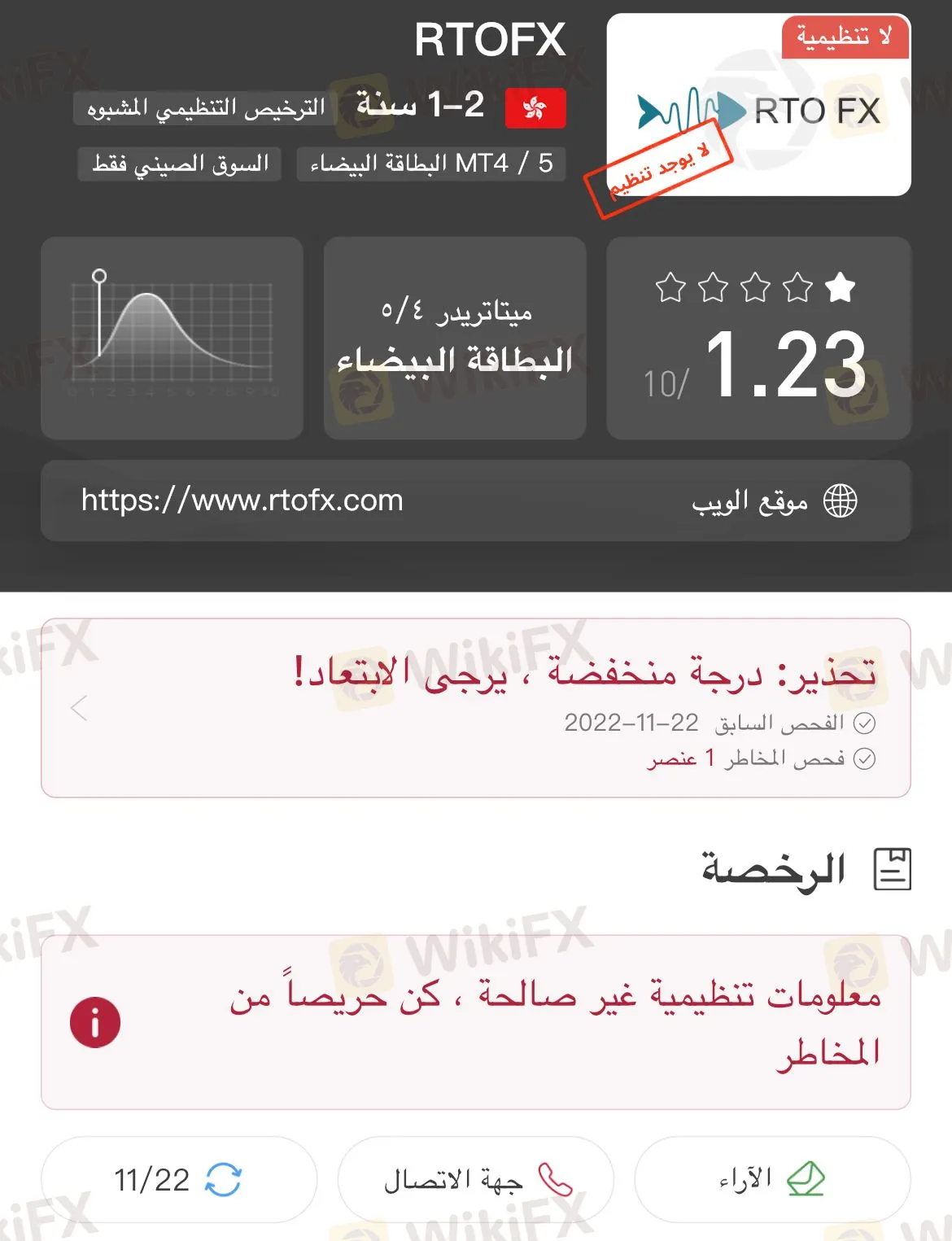 كشف تحقيق WikiFX أن وسيط RTOFX ليس لدية تراخيص و لدية تصنيف WikiFX 1،23/ 10.