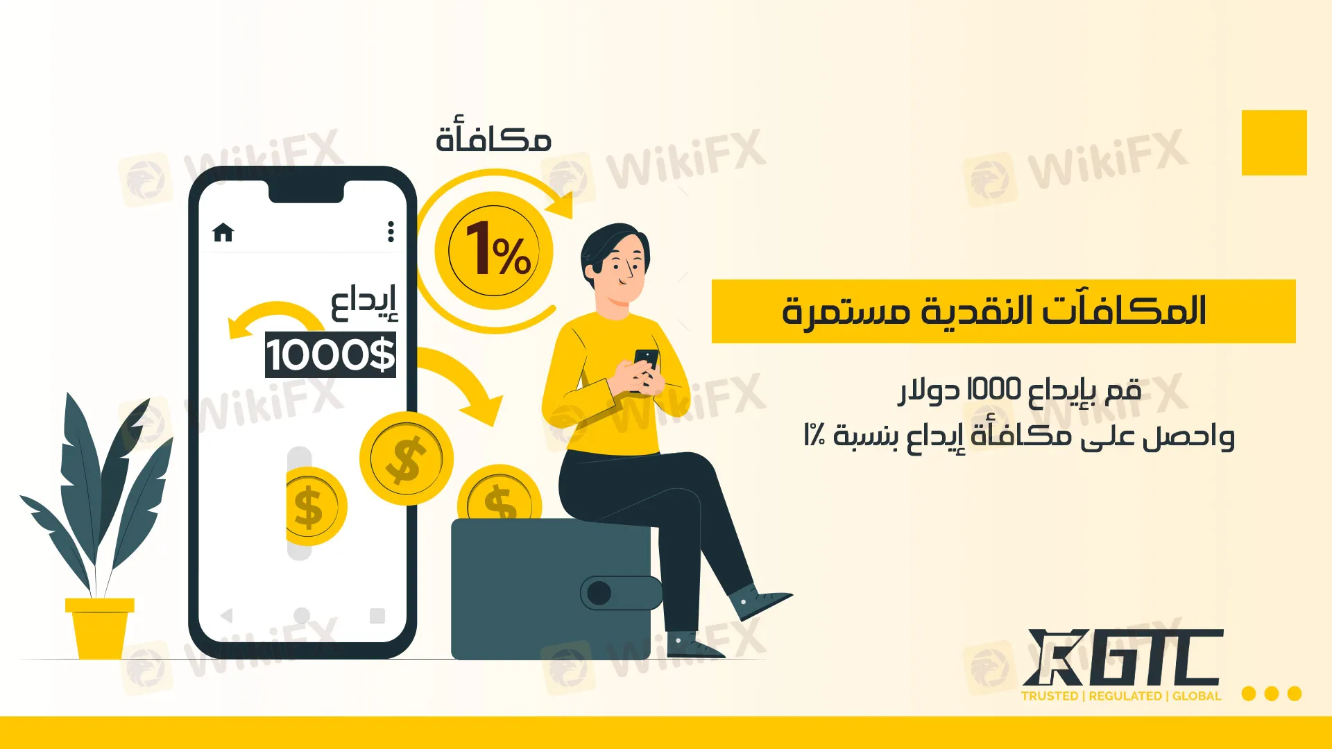 مكافأة إيداع 1%: سيحصل جميع المتداولين الجدد الذين يودعون 1000 دولار أو أكثر على مكافأة إيداع بنسبة 1%. هذه فرصة رائعة لزيادة رأس المال الخاص بك وتجربة GTC دون أي مخاطرة.