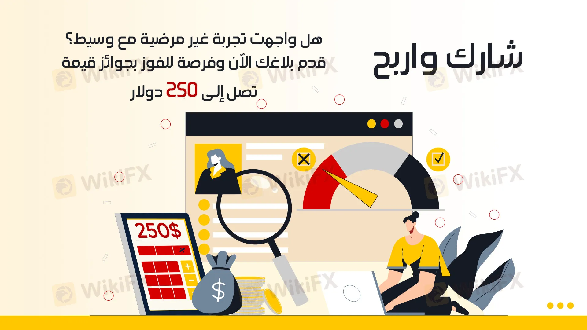 الملخص: هل واجهت تجربة غير مرضية مع وسيط الفوركس الخاص بك؟ هل ترغب في مشاركة تلك التجربة والمساهمة في تحسين بيئة التداول للجميع؟ الآن لديك الفرصة للقيام بذلك من خلال تقديم بلاغك وربما الفوز بجوائز نقدية تصل إلى 250 دولار!