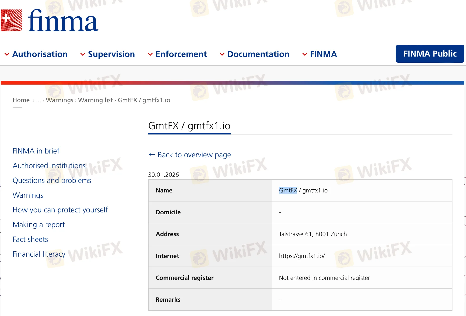 في 30 يناير 2026، أدرجت هيئة الإشراف على الأسواق المالية السويسرية FINMA منصة GmtFX / gmtfx1.io ضمن قائمة التحذيرات الرسمية الخاصة بها. ووفقًا للمعلومات المنشورة، فإن هذا الكيان غير مسجل في السجل التجاري السويسري ولا يحمل أي ترخيص يسمح له بتقديم خدمات استثمارية أو مالية داخل سويسرا.