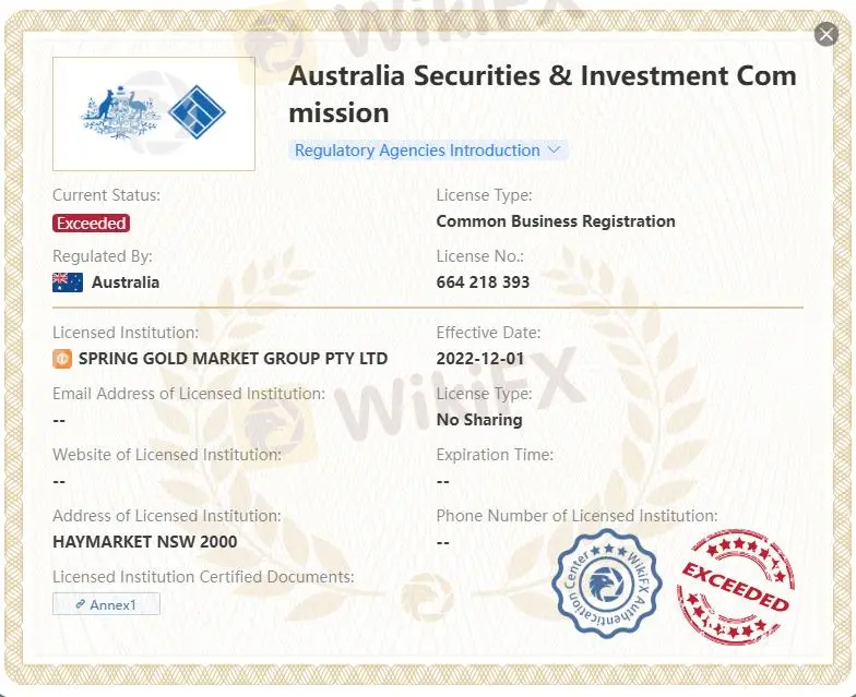Spring Gold Market unterliegt der Regulierung der Australian Securities & Investments Commission (ASIC) und besitzt die Lizenznummer 001295686.