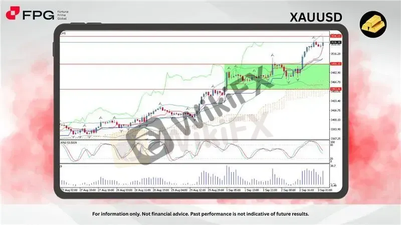 3. Support Zone: Key support lies at 3,498, the breakout level that has been retested successfully. Below that, stronger support is seen around 3,454 – 3,460, where the Ichimoku cloud and prior consolidation base align.