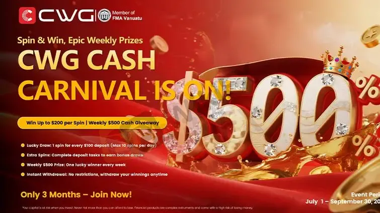 To celebrate the growth and success of CWG Markets, we invite customers from around the world to join the most spectacular Exciting Cash Carnival! By simply participating, every user has the chance to win generous cash prizes. Each day, lucky users will be drawn to receive up to $200 in cash rewards, and weekly grand prizes of up to $500 in cash are up for grabs!