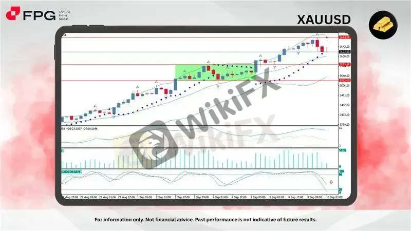Zusammenfassung:Gold prices corrected slightly lower after recently touching another all-time high near 3674. The rejection from this resistance level shows some profit-taking pressure as the price slipped back towar