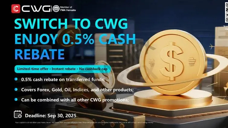 Starting today, users who transfer funds to CWG can enjoy a 0.5% cashback, applicable to a wide range of financial products including Forex, Gold, Oil, and more, with no upper limit on the cashback amount. This promotion is compatible with other CWG offers, enriching and adding more value to your trading experience.