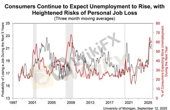 The University of Michigans recent consumer sentiment survey highlights rising concerns about unemployment. As shown in the chart below, during the 2001 tech bubble, the 2008 financial crisis, and the 2020 pandemic, both aggregate and personal unemployment risk expectations surged sharply. Currently, more than 60% of consumers expect joblessness to rise—one of the highest readings since 2009.
