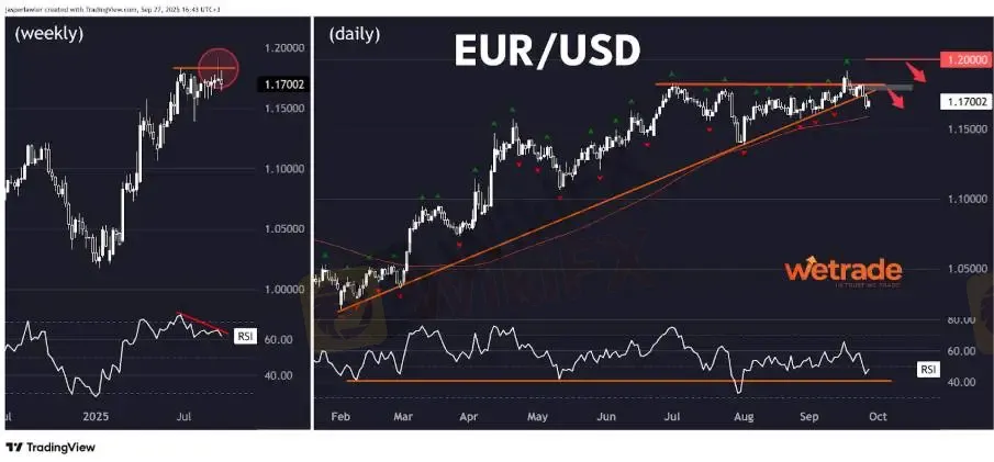 RSI already reached oversold levels in early August and has failed to get overbought since, while price has failed several attempts to break and hold above 1.36. A bounce towards the supply zone around 1.35 could present a sell trigger while a break of the uptrend line would confirm the bearish reversal.