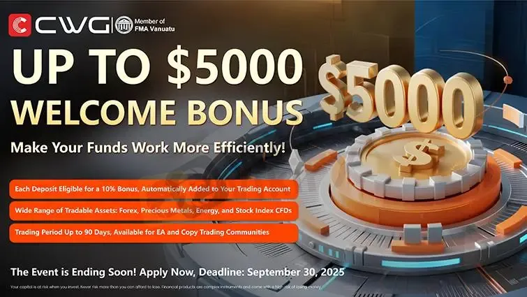 Join CWGs 10% Welcome Bonus campaign now and receive up to $5000 in bonuses on every deposit, providing stronger financial support for your trading! 🎉