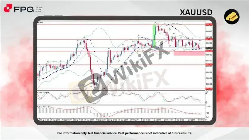 From a technical perspective, price action shows consolidation after testing the resistance zone near 3895–3871. The Bollinger Bands are narrowing, suggesting a potential breakout setup, while the Parabolic SAR is positioned above price candles, signaling short-term bearish pressure. The Stochastic Oscillator is moving in the oversold region, indicating potential buying interest if momentum strengthens. Meanwhile, the MACD is showing bearish crossover signs, pointing to weakening momentum and possible continuation of the correction if support fails to hold. Key support levels are seen at 3852 and 3831, while resistance remains firm at 3895.