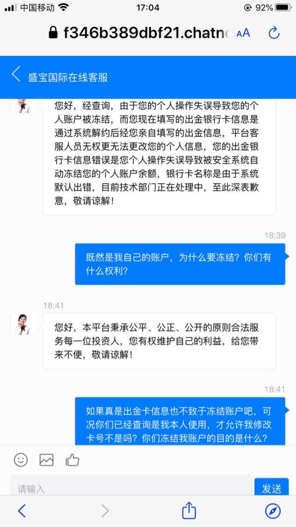 从入金大礼包开始,步步陷阱阻止出金,第一次理由个人账户信息有误,第二次又以信用分值降低为理由,限制出金,第三次以必须交保证金为理由,继续冻结我的账户,问客服人员要中文网址,客服人员竟然说这不是他们的服务范围,曝光出来就是让更多的人看看盛宝国际,到底是怎样一个平台!不是骗子是什么,我们还敢存保证金吗?搞不好又会出现要交个人所得税,这个税、那个税再次冻结账户,盛宝国际真的是层层是坑啊!问客服人员关于保证金交完能出金吗?客服回答模棱两可,要不干脆不回答,真的是令人心寒啊,三次加起来将近60万,这是怎样的一个平台,小金额出金很快,大金额就层层陷阱阻止出金,良心何在啊!