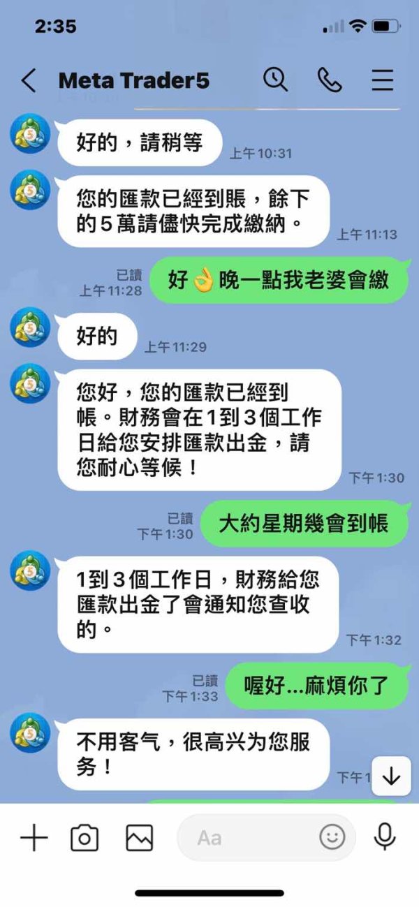 朋友帶我來這作單、朋友幫我儲了一些。2/15因爲賺了一些出金要還朋友。2/17客服人員說出金16萬美金需要繳5%的個人税金9000美金。2/18客服限定我在22號繳完稅金,威脅我以我名義全部捐出。2/22因籌不到那麼多錢,請客服寬限幾天於2/25全數繳完、核對資料說1-3天能到帳。3/2問客戶何時能到帳,給官方說法1-3天能到帳。3/4又問一次何時能到帳,請幫我問一下,結果說我還有一個平台管理費要繳10萬台幣,請客服給我幾天時間籌錢。於3/11平台管理費10萬元繳完。3/12因本人金融卡號跟存簿帳號不同、本人在3/12晚上10點多到出金後台修改資料。其間有找客服、沒有回應就收回訊息。於3/13客服說我修改資料現在要核對身分資料。核對好說我沒找客服人員說要修改資料、延誤出金或是怕匯錯帳號,要求我繳風控風險金10萬台幣。我跟客服說出金後台都要上傳證件與存簿照片、而且後台也說出金遇假日延後出金。試問假日財務有上班嗎?我只是把銀行代號改成存簿帳號也要繳。在4/6把我帳號凍結出金後台要連不上,我平台管理費繳假的嗎?