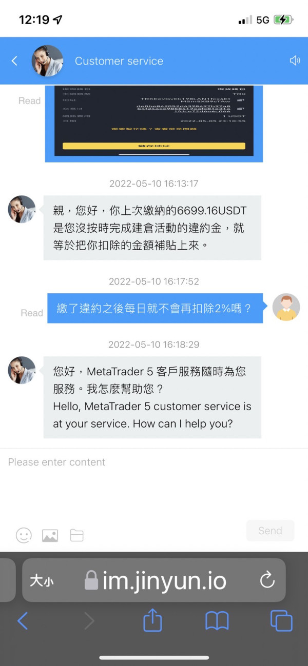 客服人員推薦建倉活動,在活動期間每天會有本金1%的利息,但沒告知完成活動的期限,詢問之後才知道活動要在1個月完成,若沒完成算違約,將扣除本金的2%做為懲罰,至完成活動就可以辦理出金業務,也詢問過除了扣除本金2%以外是否還有其他稅金、違約金等等的費用,客服也回答沒有,但在完成建倉之間沒有告知就直接將建倉入的金6699usdt直接扣除說是要繳交違約金,直到完成建倉要辦理出金業務時,客服告知因為沒有在時間內完成建倉所以要7天的審核期,7天也等了,再次辦理出金業務時客服又告知匯款紀錄裡有一筆款項涉嫌洗黑錢,要繳交本金的50%做為保證金才能辦理出金業務 在建倉活動期間完全沒有交易,只入金無出金,何來洗黑錢的嫌疑?這理由是有點離譜,相信繳了保證金也還會有其它理由阻擋出金業務,希望大家不要再上當受騙了,隨文附上與客服的對話內容
