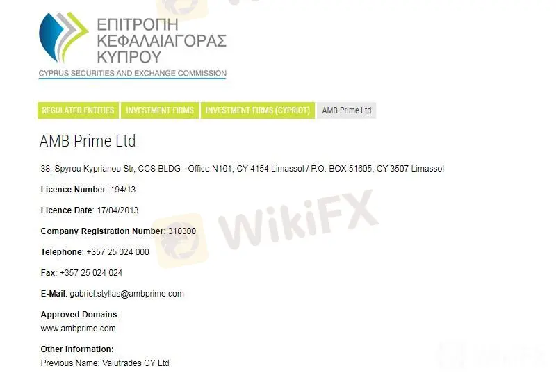 Through the visit, we conclude that the office location of AMB Prime in Cyprus truly exists and that the broker is normally in business. According to WikiFX APP, the MM license from CySEC held by AMB Prime is under valid regulation.