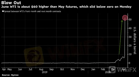 The difference between the two contracts prices is nearly US$60, indicating that there is growing concern that people who need to make physical delivery of the contract recently may have difficulties finding a place to store the crude oil because of oil refinery production cuts. The slumping demand caused by prevention measures against the coronavirus has strained the US oil storage capacity.