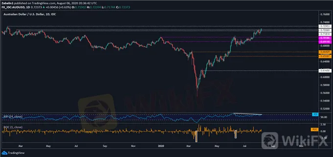 RBA is about to release the Statement on Monetary Policy today following the rate decision on August 4, which will thrust AUD into the spotlight. Since mid-March, AUD/USD has soared 25% and broken multiple layers of resistances along its ascent.