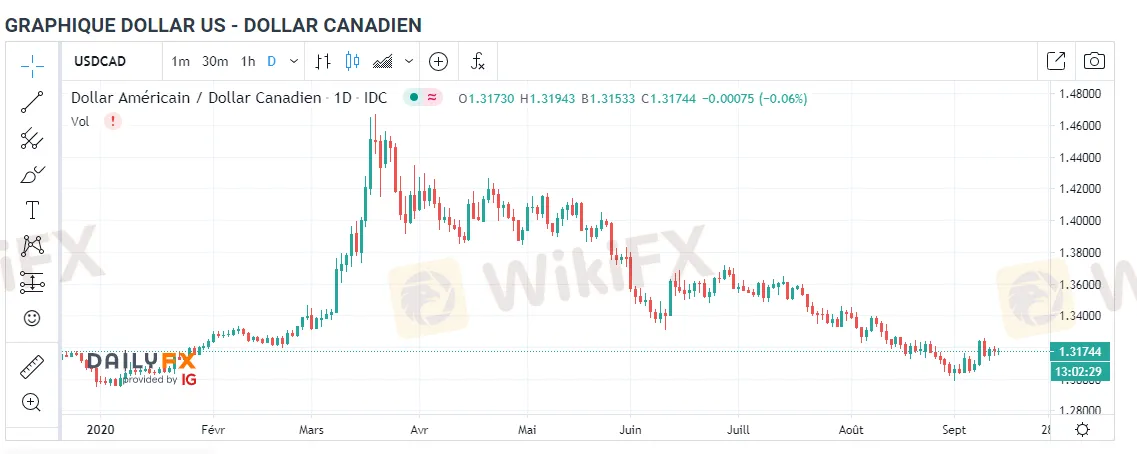Candlestick Chart of USD/CAD, from January to Mid-September 2020