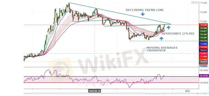 The downward trend of the currency pair seems to be getting abated but the road for bulls still looks skeptical and the range-bound move can be expected in the coming trading sessions. The bullish crossover of short term and medium term moving averages are likely to provide a cushion to the prices at lower levels while the short term negative divergence and overhead resistance of 74.70 could abate the up move for time being. Apart from this, the declining trend line originated by joining the highs of April 21, 2020, and June 18, 2020, could act as a supply point at 74.90 per USD. The base for the short term is emerging at 73.90 per USD and traders can expect the currency pair to trade in the range of 73.90 to 74.90 per USD in this trading week.
