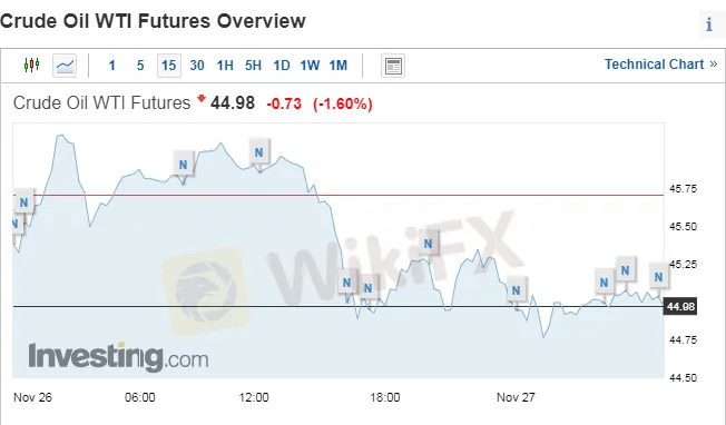 WTI was down by 69 cents, or 1.5%, at $45.02 by 0104 GMT. U.S. crude prices did not settle on Thursday due to the holiday. Brent crude was up by 9 cents at $47.89, having fallen 1.7% overnight.