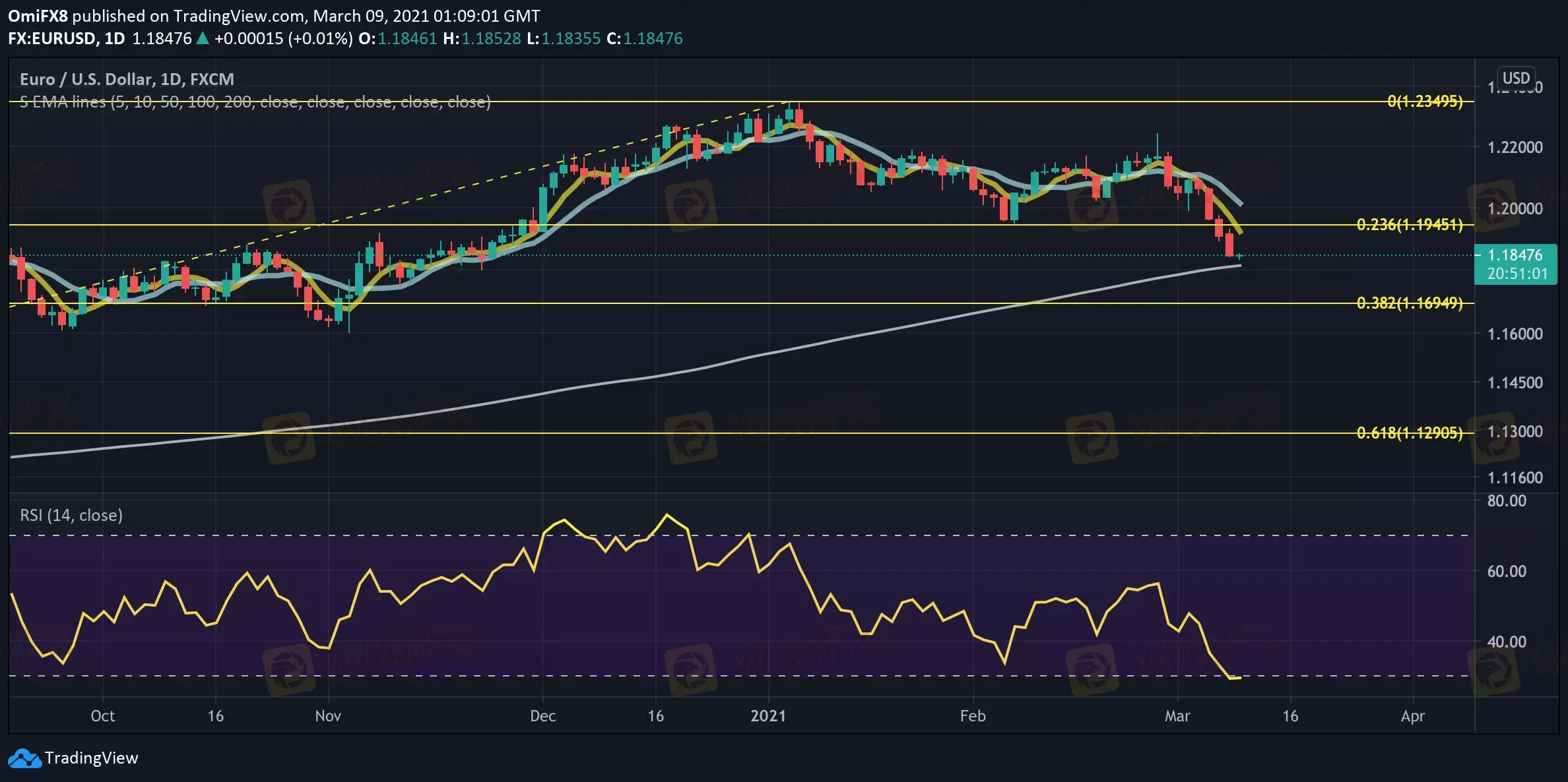 The hourly chart shows a bullish divergence of the RSI. As such, a minor bounce may be seen before a drop to the 200-day SMA.
