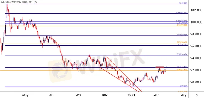 In the US Dollar – prices are testing a critical area of resistance at the moment, taken from around the 92.50 psychological level in DXY. This psych level is confluent with the 23.6% Fibonacci retracement of the 2020 sell-off and this is the same resistance zone that caught the advance earlier this month. From the Daily chart below it‘s evident that we’ve begun to test above but, as of yet, bulls havent been able to leave this confluent spot on the chart behind.