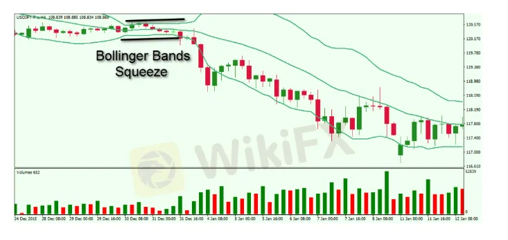 When the Bollinger Bands are close to each other, then the trading indicator is conveying to us that the volatility of the Forex pair is relatively low. In this manner, the trading volumes are typically low as well, and the pair is said to be consolidating or ranging rather than trending. This is what we call a Bollinger Band squeeze, because the bands are being “squeezed” tightly together. In most cases, we should avoid trading within very tight price ranges, because they provide significantly less profitable opportunities than during trending phases. The image below shows a classical Bollinger Bands Squeeze.