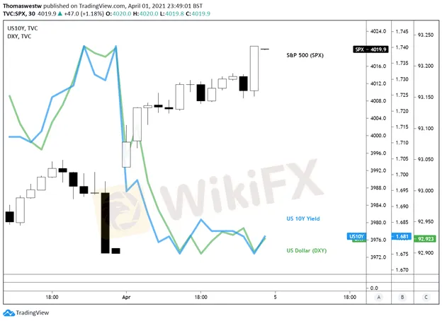 S&P 500, US DOLLAR (DXY), 10-YEAR TREASURY YIELD – 30 MINUTE CHART
