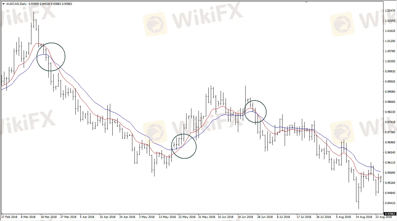As you can see on the chart above, the moving average is crisscrossing three different times. Traders will simply buy and sell every time they get a crossover. Because of this, the trader is always in the market. As a side note, I would point out that you need both moving averages either turning up or down to give a better signal, as this is a trend following system, meaning that you get chopped up in a sideways market as the moving averages can cross back and forth randomly.