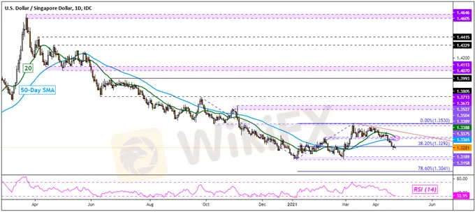 The US Dollar extended declines against the Singapore Dollar since last week, as anticipated. USD/SGD pierced the 1.3375 – 1.3389 inflection zone, confirming the breakout. Now, the 50-day Simple Moving Averaged could cross above the 20-day, forming a bearish crossover. That may precede further losses, opening the door for the pair to retest the 1.3158 – 1.3189 support zone established earlier this year. In the event of a material turn higher however, keep an eye on what may be a falling trendline from March – see chart below.