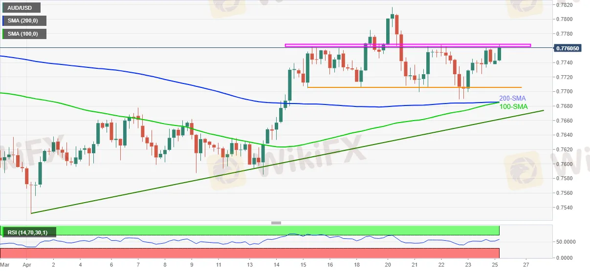 AUD/USD stays on the front foot around 0.7760, up 0.27% intraday, amid early Monday. In doing so, the aussie pair buyers attack a key resistance zone comprising multiple tops marked since mid-April.