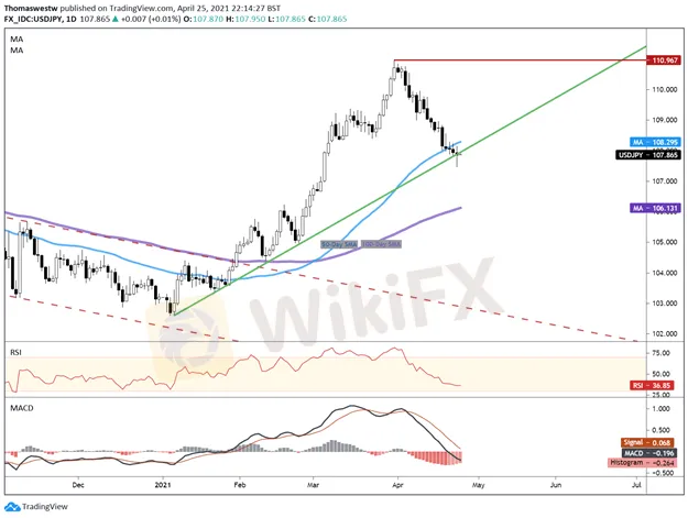 USD/JPY DAILY CHARTThe Japanese Yen strengthened against the US Dollar last week, bringing USD/JPY to an ascending trendline formed off the January swing low. A break below support would likely see the currency pair fall further, perhaps to the 100-day Simple Moving Average (SMA). Should support hold, however, a bounce higher to retake the 50-day SMA and subsequently test the March multi-month swing high at 110.96 may be on the cards.