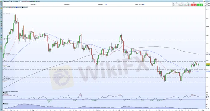 The daily chart shows gold trapped between old resistance between $1,760-$1764/oz. and a cluster of recent highs topping out at $1,800/oz. The precious metal has moved out of overbought territory, while the 20-day sma and 50-day sma crossover gives the precious metal a positive look. It is difficult to say with conviction which way a break may occur but the likelihood is that a break will happen soon with all the volatile events this week.