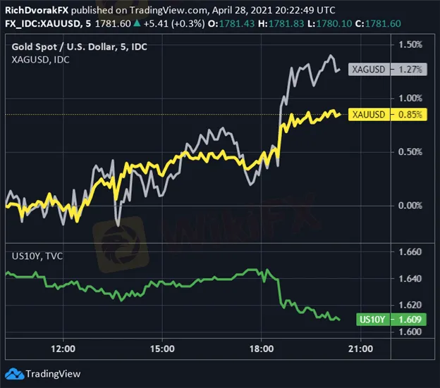 GOLD PRICE CHART WITH SILVER & TEN-YEAR TREASURY YIELD OVERLAID: 5-MINUTE TIME FRAME (28 APRIL 2021 INTRADAY)