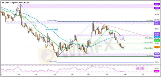 The US Dollar remains at risk to the Indonesian Rupiah after USD/IDR appeared to top earlier in April. This followed a brewing bearish Rising Wedge chart pattern. A breakout subsequently occurred, with the pair achieving confirmation thereafter. Now, immediate support seems to be at the 23.6% Fibonacci retracement at 14462, with the 50-day SMA sitting below.