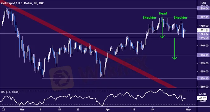 GOLD TECHNICAL ANALYSISGold prices may forming a bearish Head and Shoulders (H&S) pattern just the $1800/oz figure. Confirming the setup with a daily close below the 1755.83-64.22 area may set the stage for a push through the support shelf at 1720.80. Neutralizing the topping pattern calls for a breach of the swing high at 1797.83.