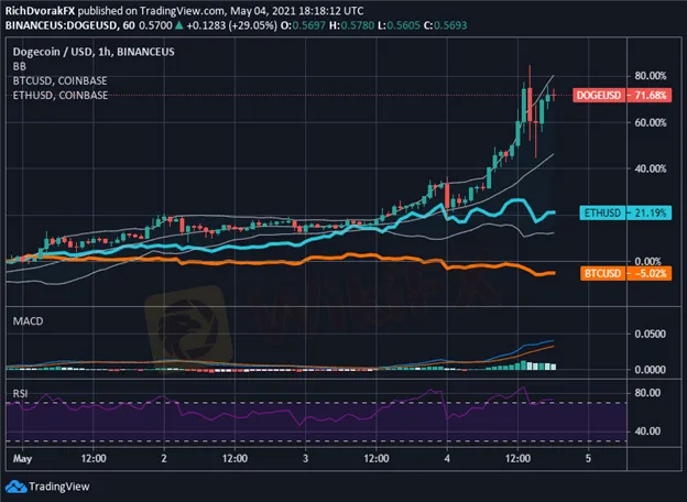 Ethereum price action also seems to be drifting lower from all-time highs as ETH/USD bulls unwind exposure after probing the $3,500-level earlier in the day. Perhaps these moves can be explained by a natural rotation of positioning out of Bitcoin and Ethereum into Dogecoin. Dogecoin strength interestingly comes amid broader risk aversion judging by performance across major stock indices. While some are arguing that the “Sell in May and Go Away” anomaly is at play here, there have been a few eye-catching headlines about potential Fed tapering.