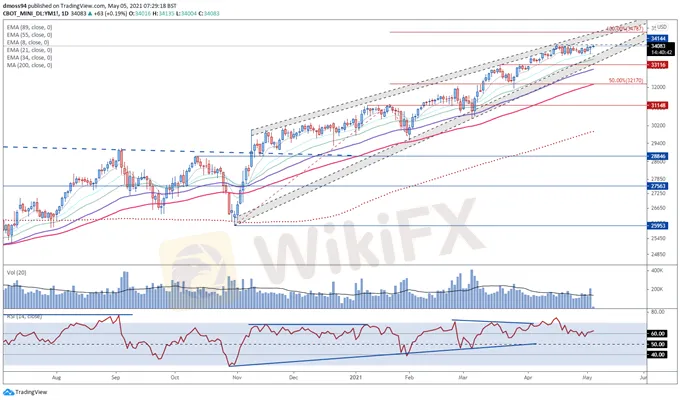 From a technical perspective, the Dow Jones looks poised to continue moving higher in the near term, as price continues to track above all six moving averages.