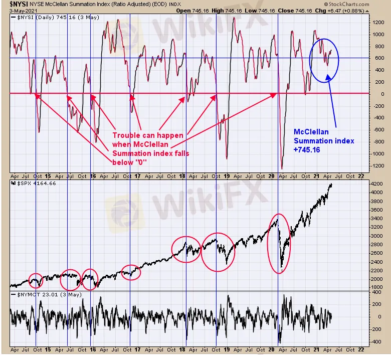 Investors may be wondering if this is the start of a larger decline; according to the chart below the answer is no. The top window is the NYSE Summation index. Markets weaken first before a large decline begins. The weakness comes in the form of the advance/Decline which is the components of the Summation index above. Large declines can begin when the McClellan Summation index falls below 0 (noted with blue vertical lines). Current McClellan Summation index stands at +745 and in a relative strong position.