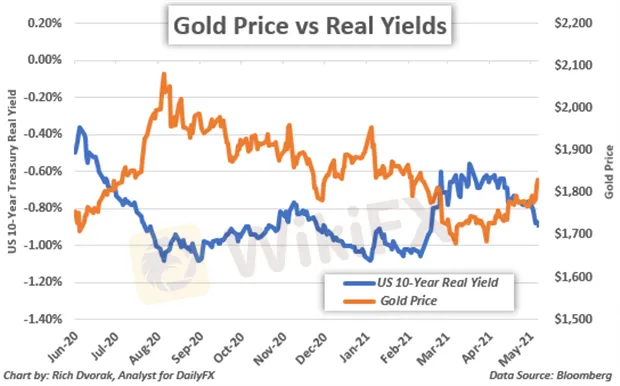 GOLD PRICE CHART WITH TEN-YEAR REAL YIELDS OVERLAID: DAILY TIME FRAME (02 JUNE 2020 TO 10 MAY 2021)