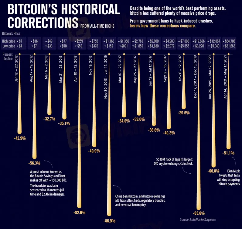 Using data from CoinMarketCap, this graphic looks at bitcoins historical price corrections from all-time highs.