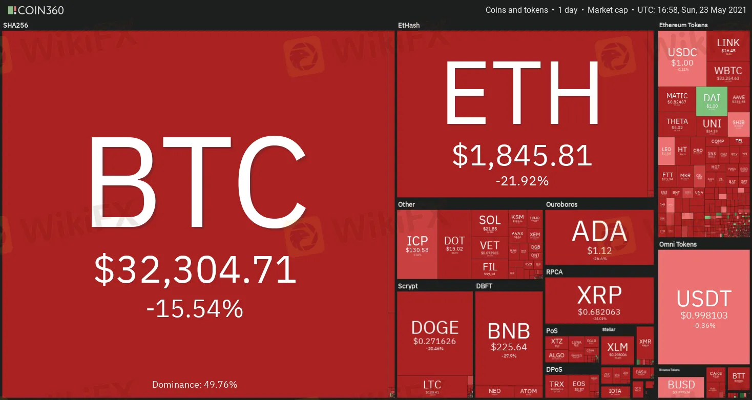 BTC/USDTBitcoin (BTC) dipped and closed below the 200-day simple moving average ($40,235) on May 19. Institutional investors watch this indicator closely and usually avoid buying if the price sustains below it for an extended duration.