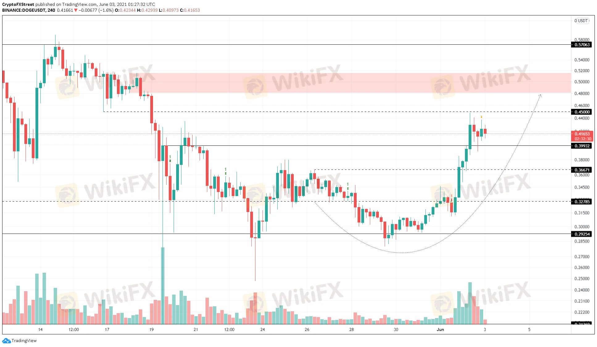 Such indecision suggests that the rally might not be over yet and that a further spike in Dogecoin price is possible. In this case, the doge-themed cryptocurrency could rally another 16% to tag the said supply zones lower limit at $0.481.