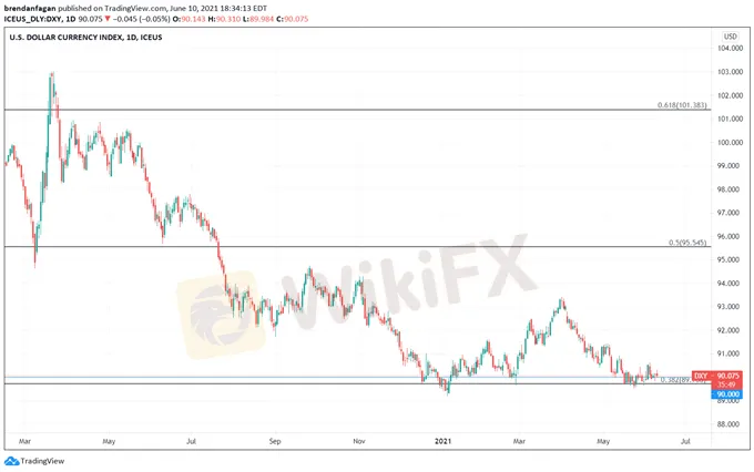 Taking into account a potential taper in the coming months along with continued strong economic data, the catalysts are present for the Dollar Index to push higher even in the face of unsustainable government spending. Continuing on the current trajectory toward “substantial further progress,” as the Federal Reserve puts it, may push the Dollar Index back towards the 0.5 Fib level at 95.545 or even toward pre-COVID levels near 100. The debate surrounding the recovery and this potential infrastructure bill revolves around one question – has American exceptionalism been priced in? Given the Greenbacks resilience in 2021, holding above 90.00, another potential $1.2 trillion in fiscal spending may not provide as large a shock to the system as some might think.