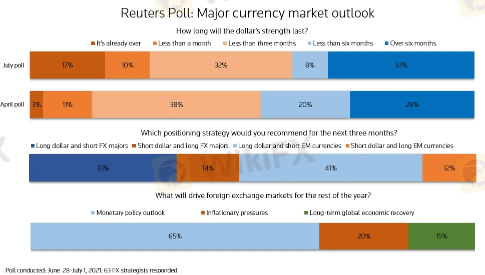 But in response to an additional question, about 75% of analysts, or 38 of 51, suggested long dollar bets and short other major currencies or emerging market ones in the next three months as a positioning strategy.