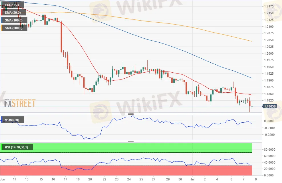EUR/USD short-term technical outlookThe risk for the EUR/USD pair remains skewed to the downside. The 4-hour chart shows that the pair keeps developing below all of its moving averages, which head lower with uneven degrees of bearish strength. Technical indicators, in the meantime, remain near daily lows without clear directional strength. An approach to the 1.1700 level is on the cards, mainly on a break below the daily low.