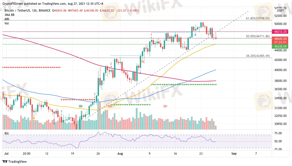 Bitcoin price sliced below the crucial diagonal line of defense on August 26, as the buyers struggled to lift prices higher. Currently, BTC is sitting around the 50% Fibonacci extension level at $46,711 as support.