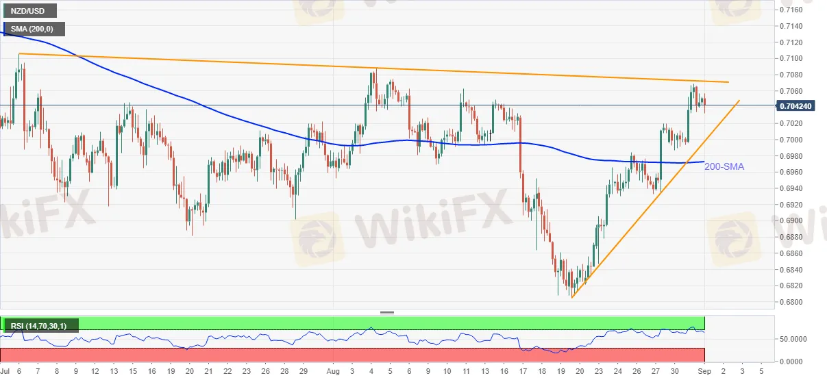 Meanwhile, an upside clearance of the stated resistance line around 0.7070 will direct NZD/USD bulls to highs marked in August and July, near 0.7085 and 0.7105 respectively.