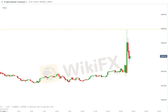 Gold shot up in response to the worse than expected NFP data as can be seen from the 5-minute chart below: