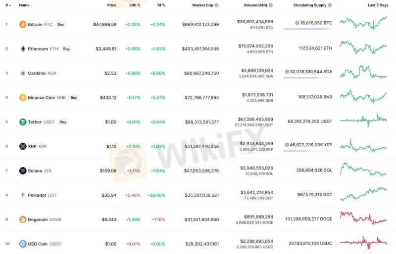 Binance Coin (BNB) has gained less than Cardano (ADA), with growth accounting for 5.77%.