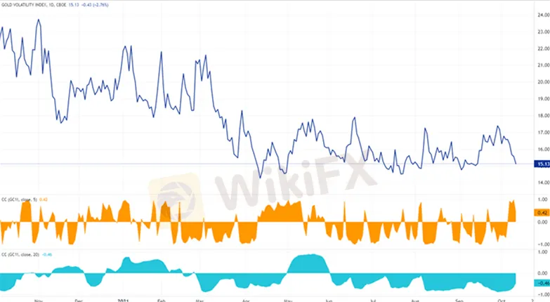 Gold volatility (as measured by the Cboes gold volatility ETF, GVZ, which tracks the 1-month implied volatility of gold as derived from the GLD option chain) was trading at 16.52. The relationship between gold prices and gold volatility is normalizing, insofar as the 5-day correlation is becoming less positive this week while the 20-day correlation remains in negative territory. The 5-day correlation between GVZ and gold prices is +0.42 while the 20-day correlation is -0.46. One week ago, on October 5, the 5-day correlation was -0.70 and the 20-day correlation was -0.84.